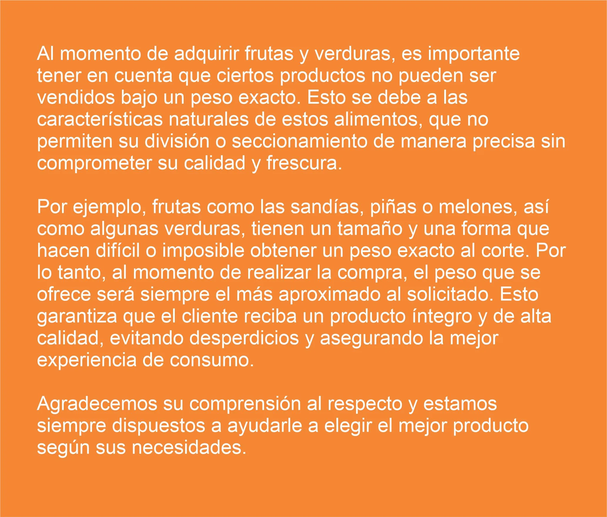 Por ejemplo, frutas como las sandías, piñas o melones, así como algunas verduras, tienen un tamaño y una forma que hacen difícil o imposible obtener un peso exacto al corte. Por lo tanto, al momento de realizar la compra, el peso que se ofrece será siempre el más aproximado al solicitado. Esto garantiza que el cliente reciba un producto íntegro y de alta calidad, evitando desperdicios y asegurando la mejor experiencia de consumo.